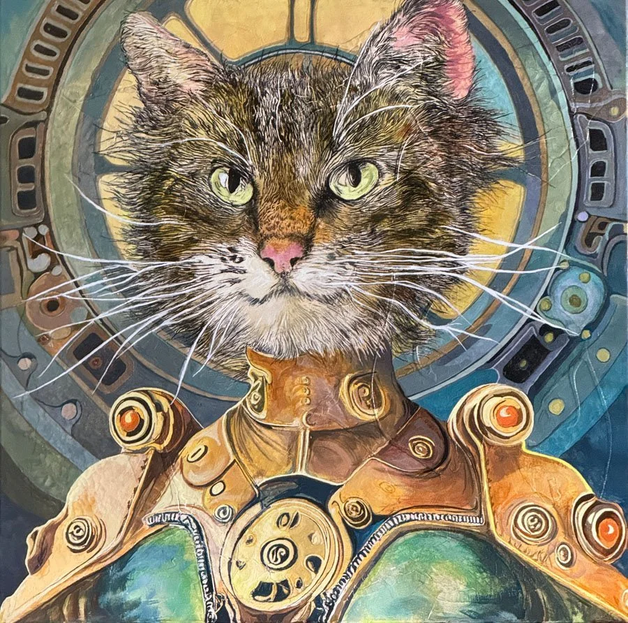 This is her story…Within the feline world created from my paintings this is a sad tiny story we call “The Migrant Calico.” Her family murdered